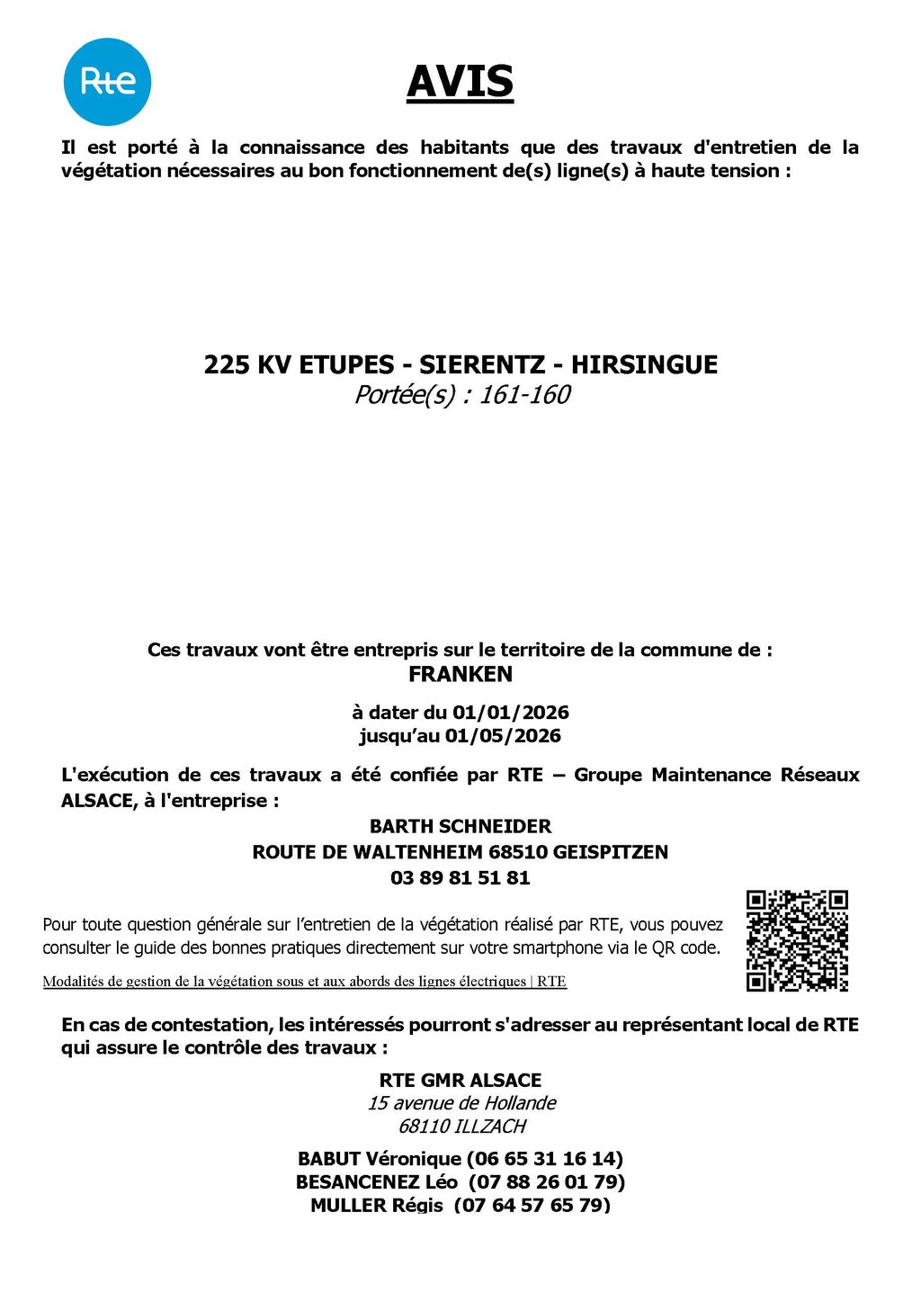 Il est porté à la connaissance des habitants que des travaux d'entretien de la végétation nécessaires au bon fonctionnement de(s) ligne(s) à haute tension :