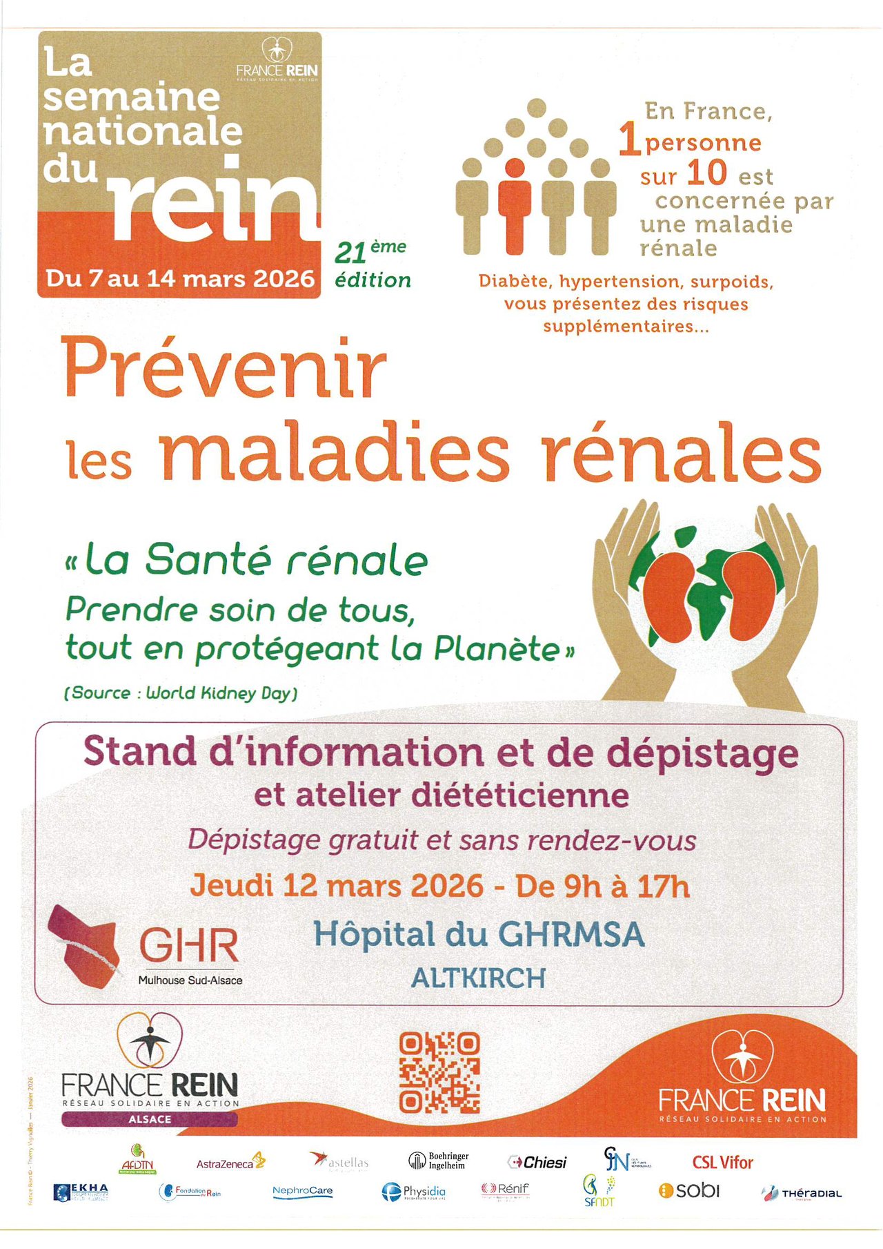 Dans le cadre de la semaine nationale du Rein, le Centre hospitalier du GHR ALTKIRCH en partenariat avec France Rein Alsace et AURAL Alsace propose à la population de venir se faire dépister gratuitement et sans rendez-vous.
